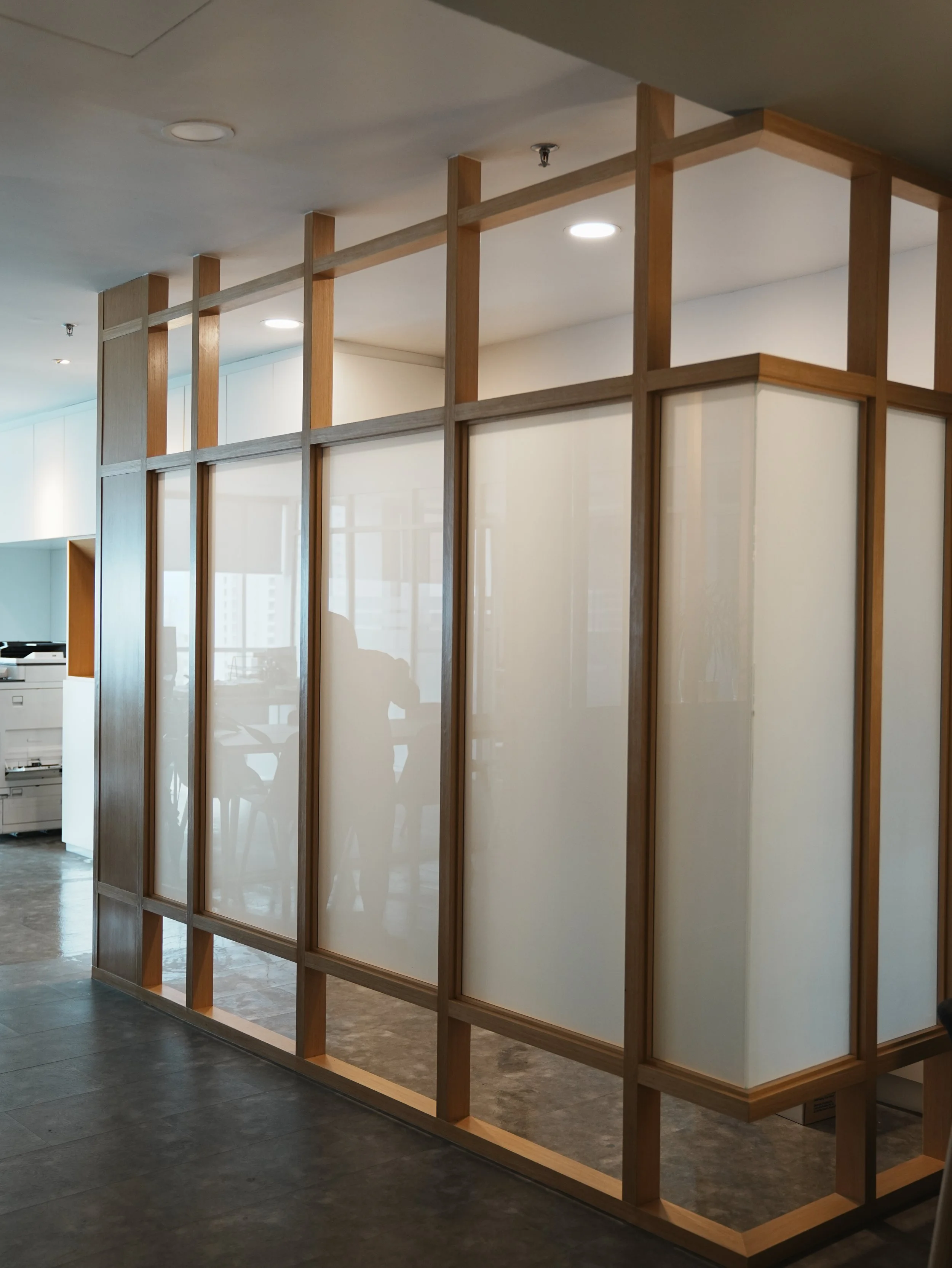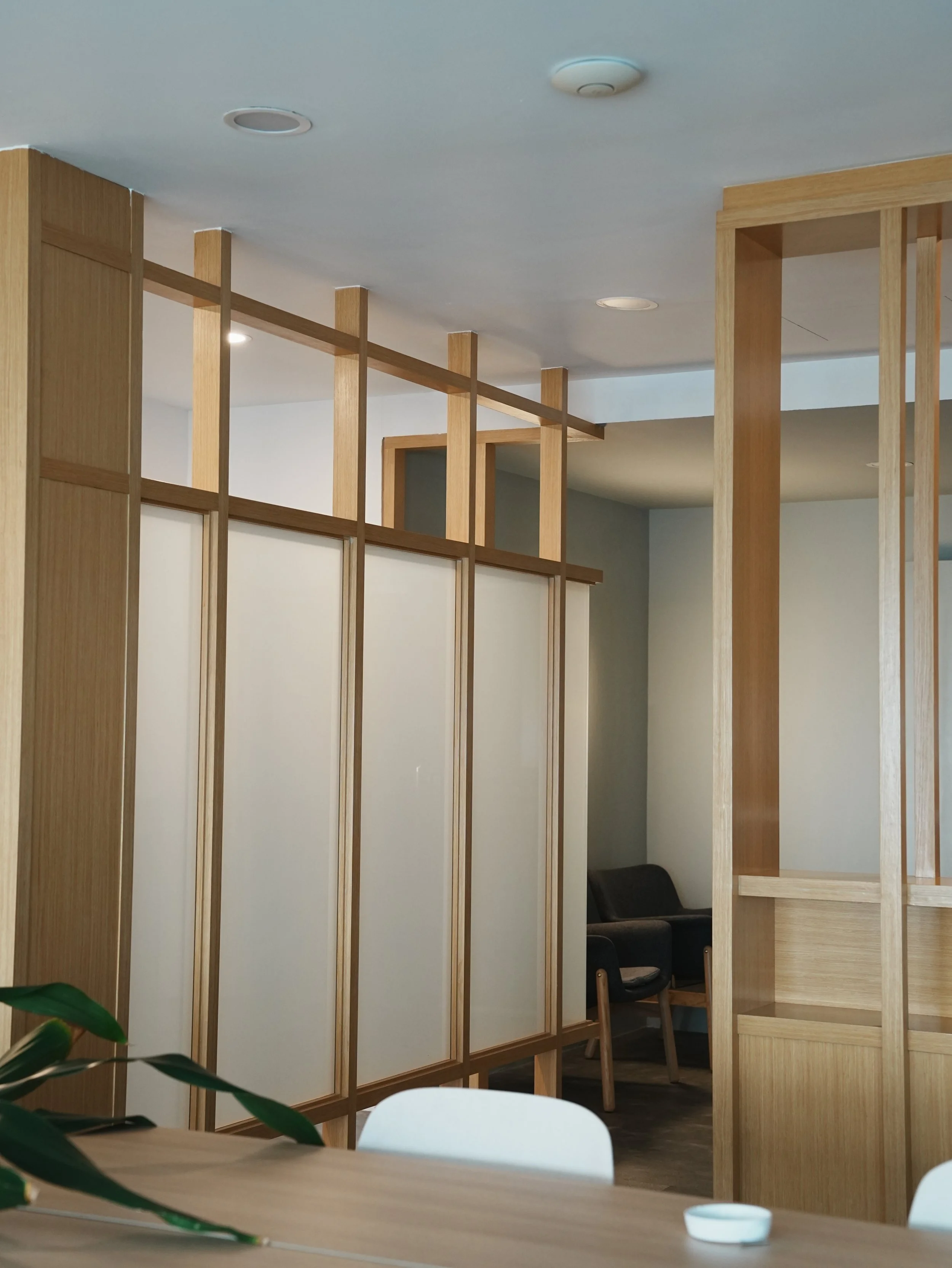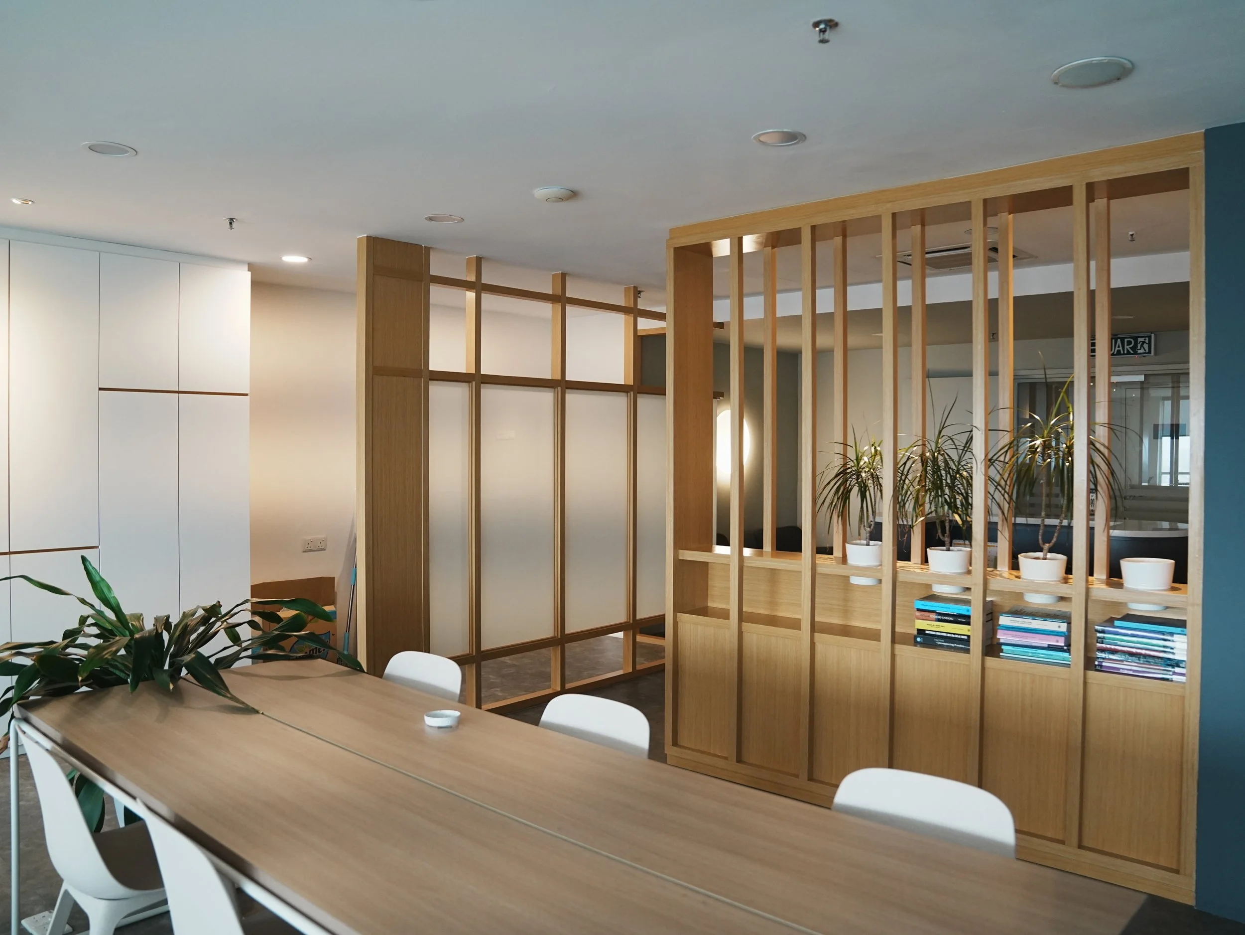 Inspired by the client’s love for plants and her preference for a light color palette, the office renovation embraces a minimal Scandinavian design. Oak timber is used throughout to bring a sense of natural warmth, especially in the reception area. The reception features two open-style partitions that allow natural light to flow in and maintain visual connection with the general office. One partition, designed in an L-shape with frosted glass panels, subtly conceals the adjacent office pantry while maintaining a semi-open feel. The second partition is uniquely crafted with integrated shelving to accommodate potted plants, giving the client a personalized space to showcase her greenery.