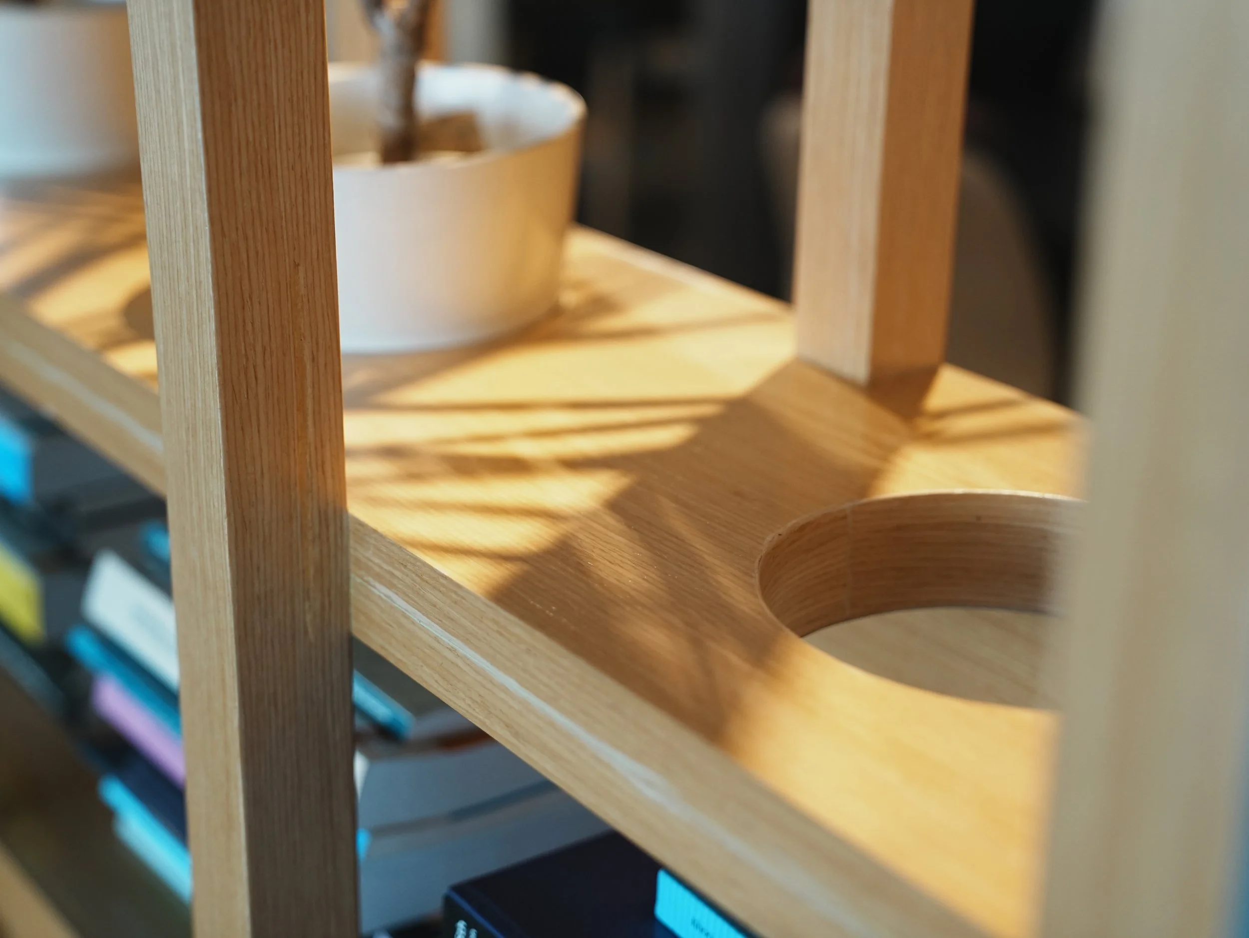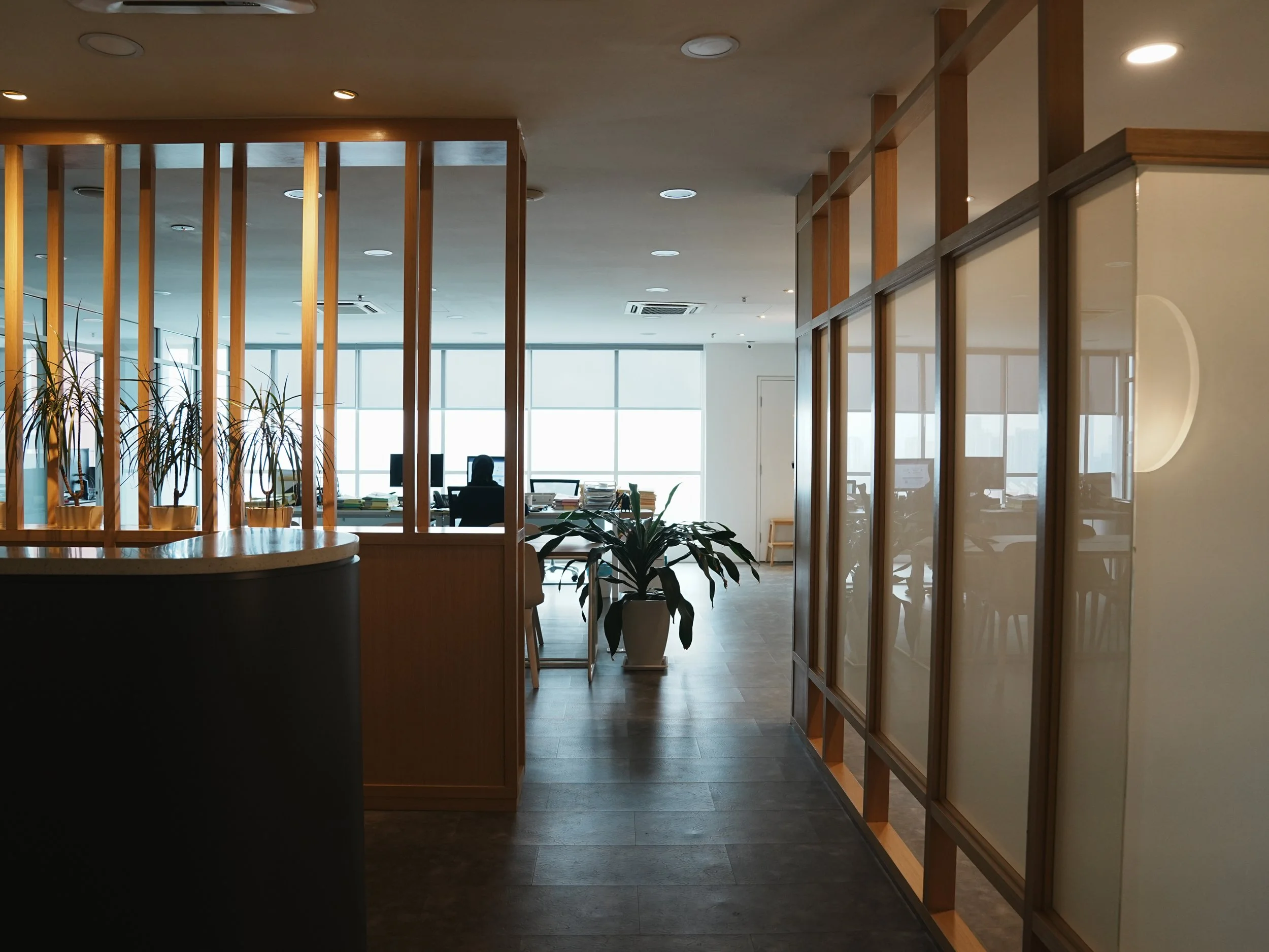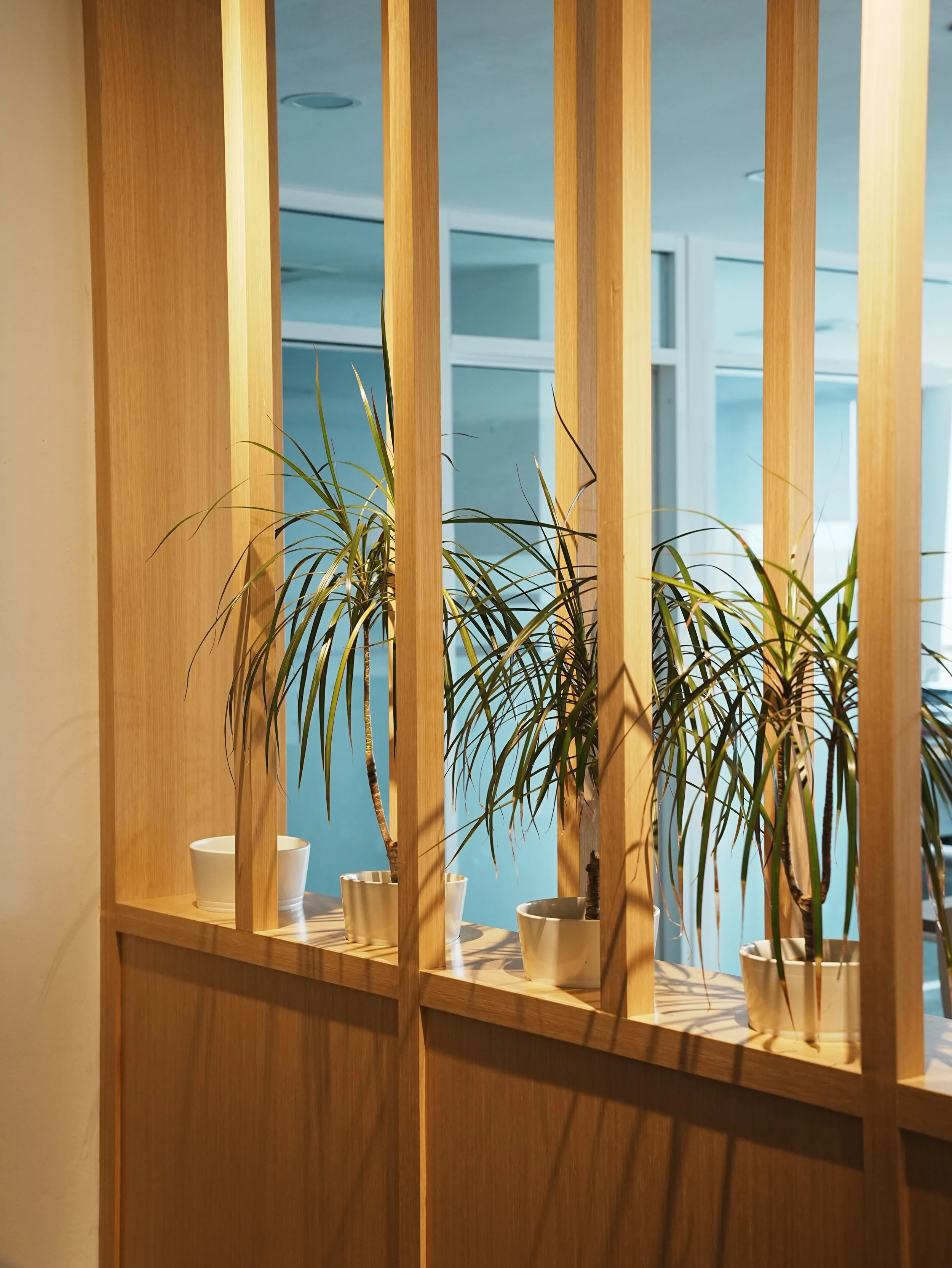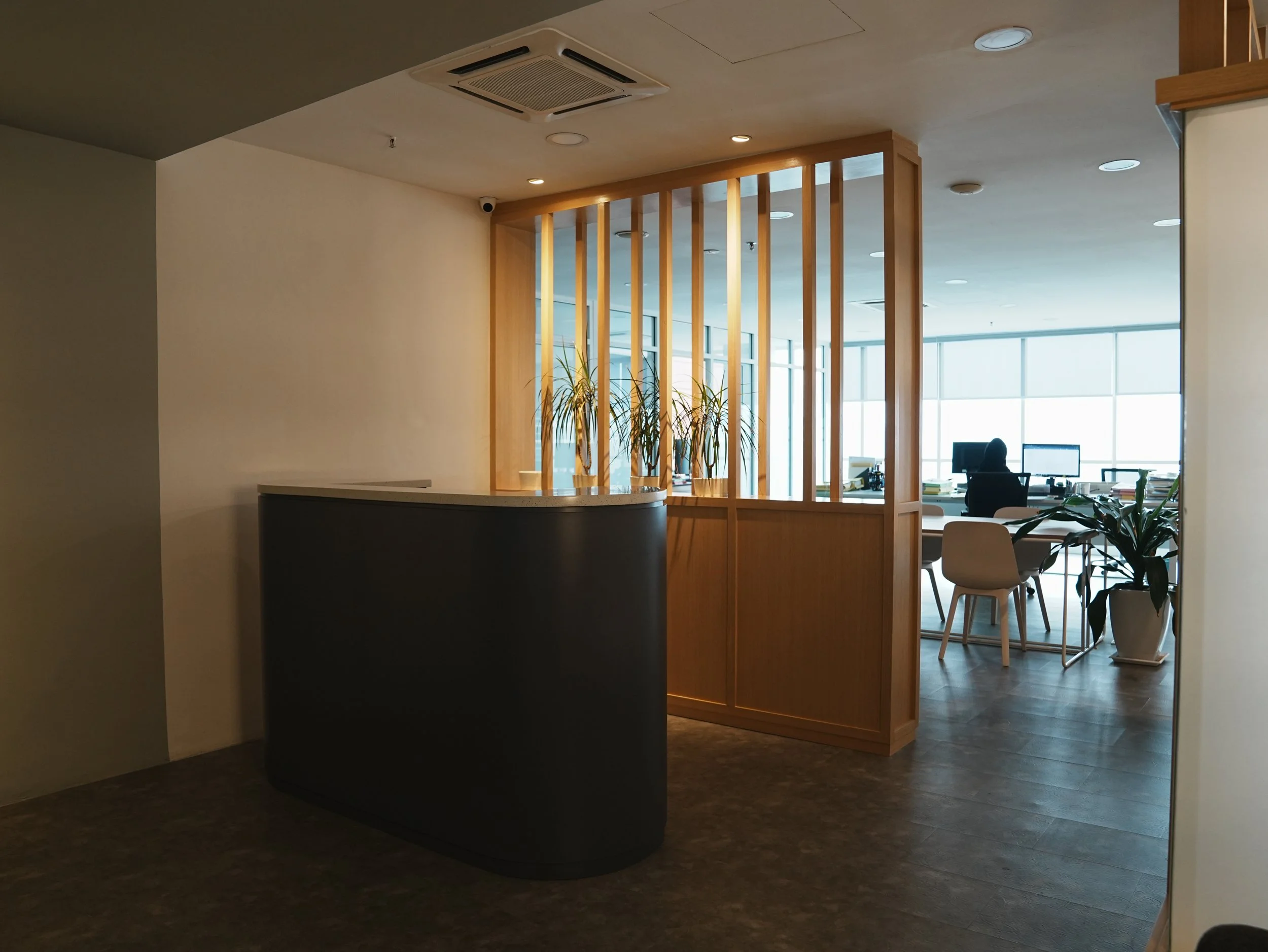 Inspired by the client’s love for plants and her preference for a light color palette, the office renovation embraces a minimal Scandinavian design. Oak timber is used throughout to bring a sense of natural warmth, especially in the reception area. The reception features two open-style partitions that allow natural light to flow in and maintain visual connection with the general office. One partition, designed in an L-shape with frosted glass panels, subtly conceals the adjacent office pantry while maintaining a semi-open feel. The second partition is uniquely crafted with integrated shelving to accommodate potted plants, giving the client a personalized space to showcase her greenery.